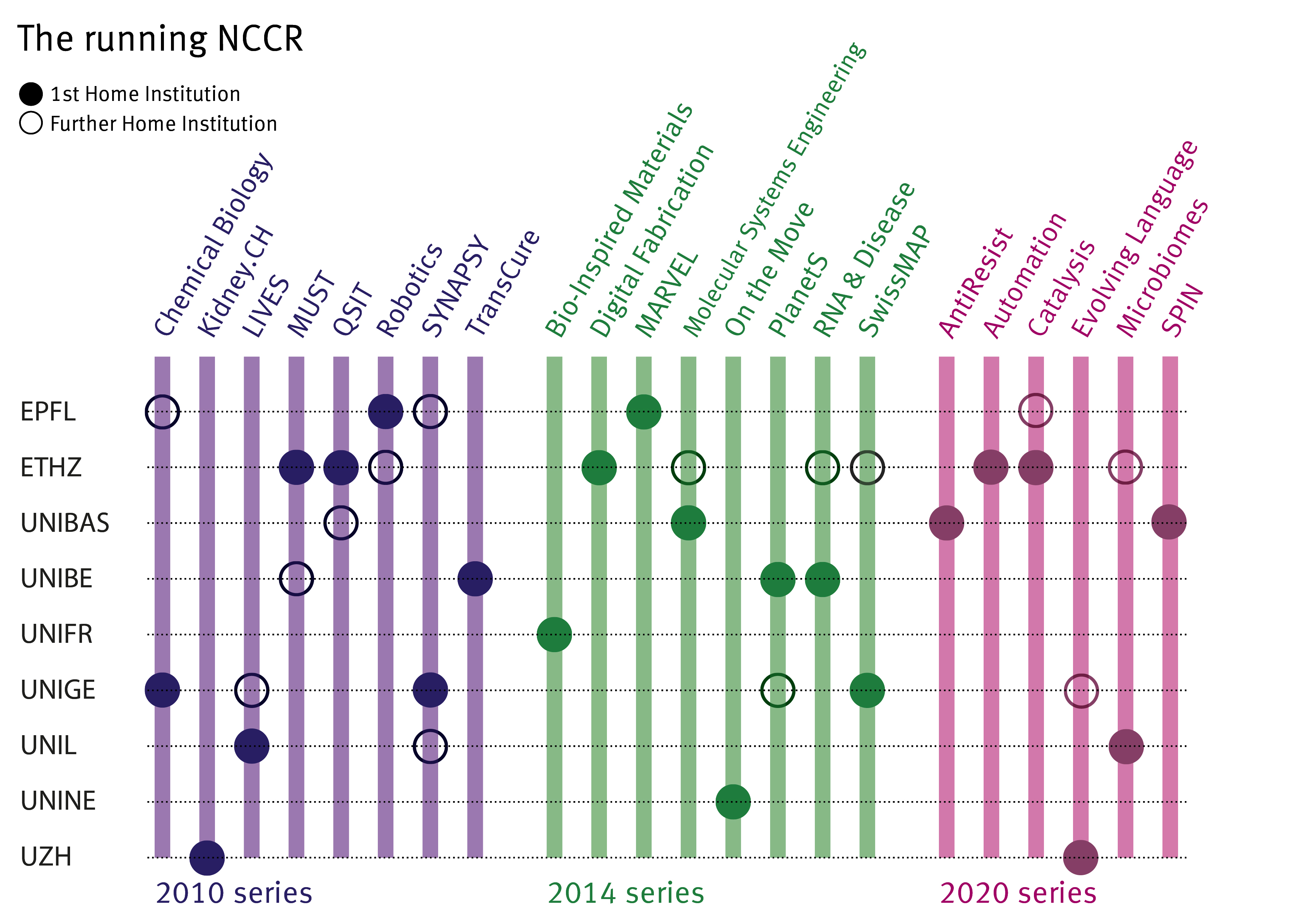 The NCCR management teams are based at a higher education institution or at another renowned research institution. Besides the research groups based at the home institution, a centre of competence also avails itself of a network of other teams across Switzerland. This enables the NCCRs to contribute to better improve research structures in Switzerland.