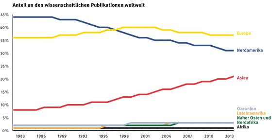 Der Anteil der Forschungsarbeiten mit Beteiligung asiatischer Forschender verdreifachte sich in drei Jahrzehnten auf heute 21 Prozent. Europa hat Nordamerika 1995 überholt und weist nun stabile Zahlen auf. Die Wachstumsraten der aufstrebenden Regionen (Asien, Afrika, Lateinamerika) betragen bis zu 8 Prozent. Das Gesamtvolumen der Publikationen hat sich auf 2,4 Millionen Artikel pro Jahr verdreifacht.