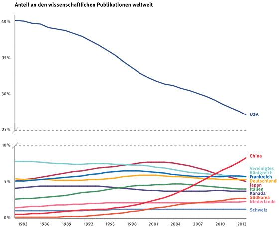 Der Anteil der Publikationen aus den USA ist in drei Jahrzehnten von 40 auf 27 Prozent gefallen. China verzeichnete einen spektakulären Anstieg von unter 1 auf 8 Prozent. Namentlich Südkorea, Taiwan, Brasilien und Indien veröffentlichten wesentlich mehr. Der Anteil der Schweiz blieb sehr stabil.