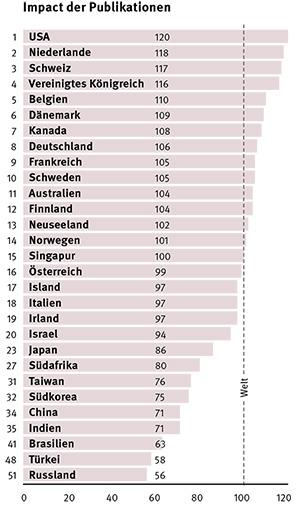 Die Arbeiten aus den USA, der Schweiz und Grossbritannien haben den höchsten wissenschaftlichen Impact. Die Qualität der Forschung aus den Schwellenländern ist noch unter dem weltweiten Durchschnitt (100 Punkte), hat sich aber stark gesteigert, besonders in China, das seit 1981 von 30 auf 71 Punkte zulegte.