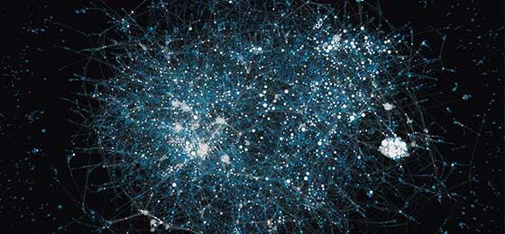 Eng verknüpfte Gemeinschaften lassen sich im zentralen Bereich des Netzes finden, das Zentrum selbst weist allerdings nicht die grösste Dichte auf. Wie Satelliten im fernen Orbit schweben weiter aussen Wissenschaftler, deren Namen nur in einer begrenzten Anzahl von Projekten auftauchen oder die in einem Bereich forschen, in dem nur sehr wenige, ebenfalls isolierte Personen tätig sind.
