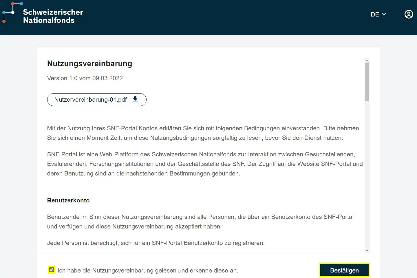 Akzeptieren Sie bitte die Nutzungsvereinbarung, anschliessend können Sie das SNF-Portal nutzen.