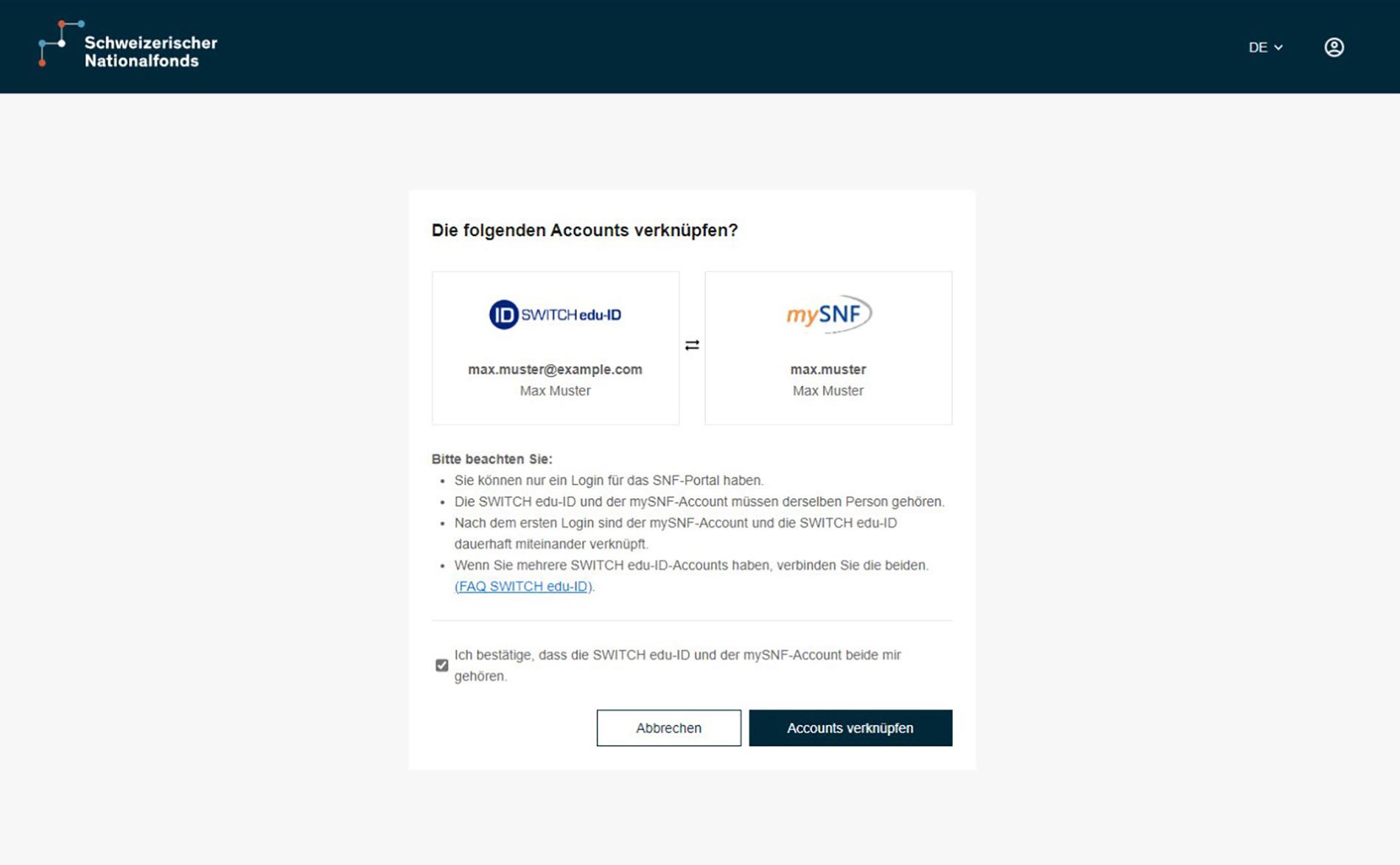 Bestätigen Sie, dass die SWITCH edu-ID und das mySNF-Konto Ihnen gehören und verknüpfen Sie die beiden Konten. Lesen Sie bitte aufmerksam, dieser Schritt kann nicht rückgängig gemacht werden.