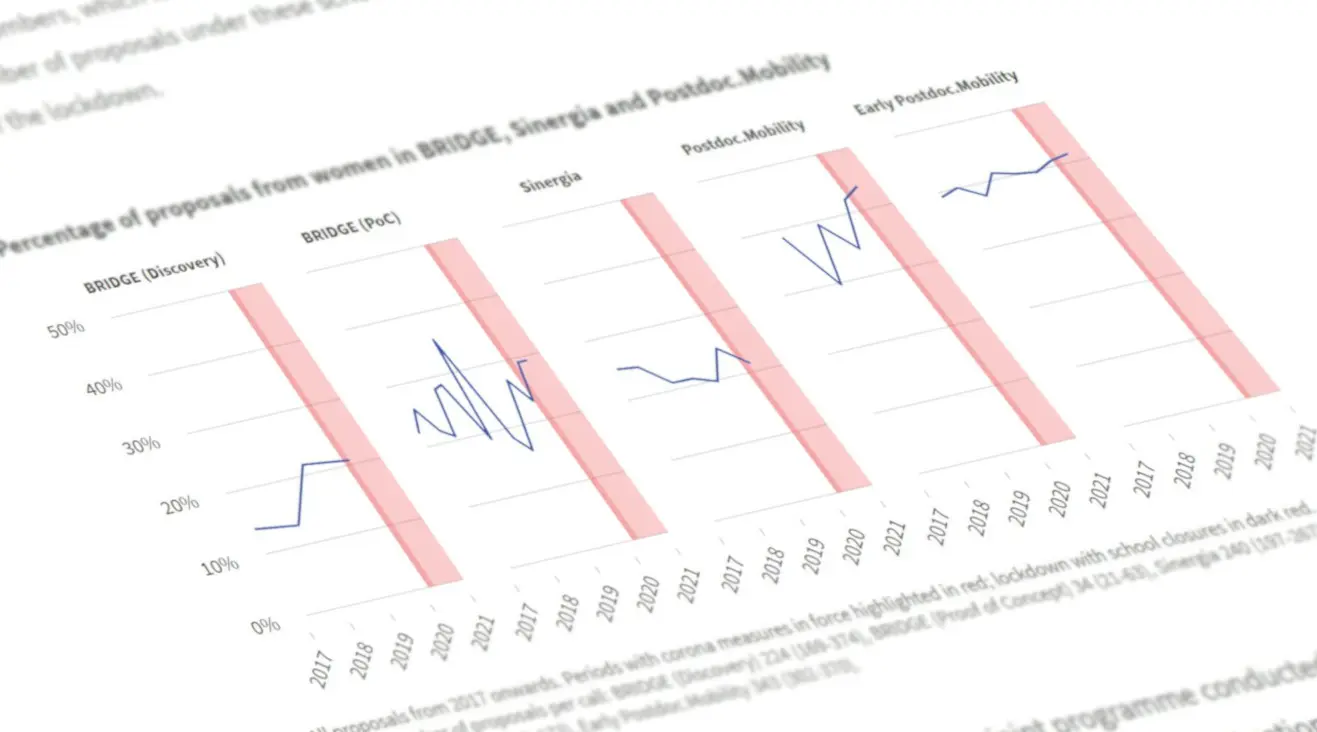 Studies and surveys confirm that during the COVID-19 pandemic, women’s workload at home has increased. Does that mean women researchers are also submitting fewer proposals to the SNSF? Analyses show that, with one exception, their share has remained stable.