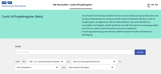 The database contains all research projects supported by the SNSF on the topic of Covid-19. In addition to normally funded projects, the database includes projects funded through the special call on coronaviruses. In the future, the database will also list projects that are part of the National Research Programme “Covid-19” (NRP 78). In addition, the database contains projects financed by other sources, currently Innosuisse and the European research framework programme Horizon 2020, with Swiss participation.