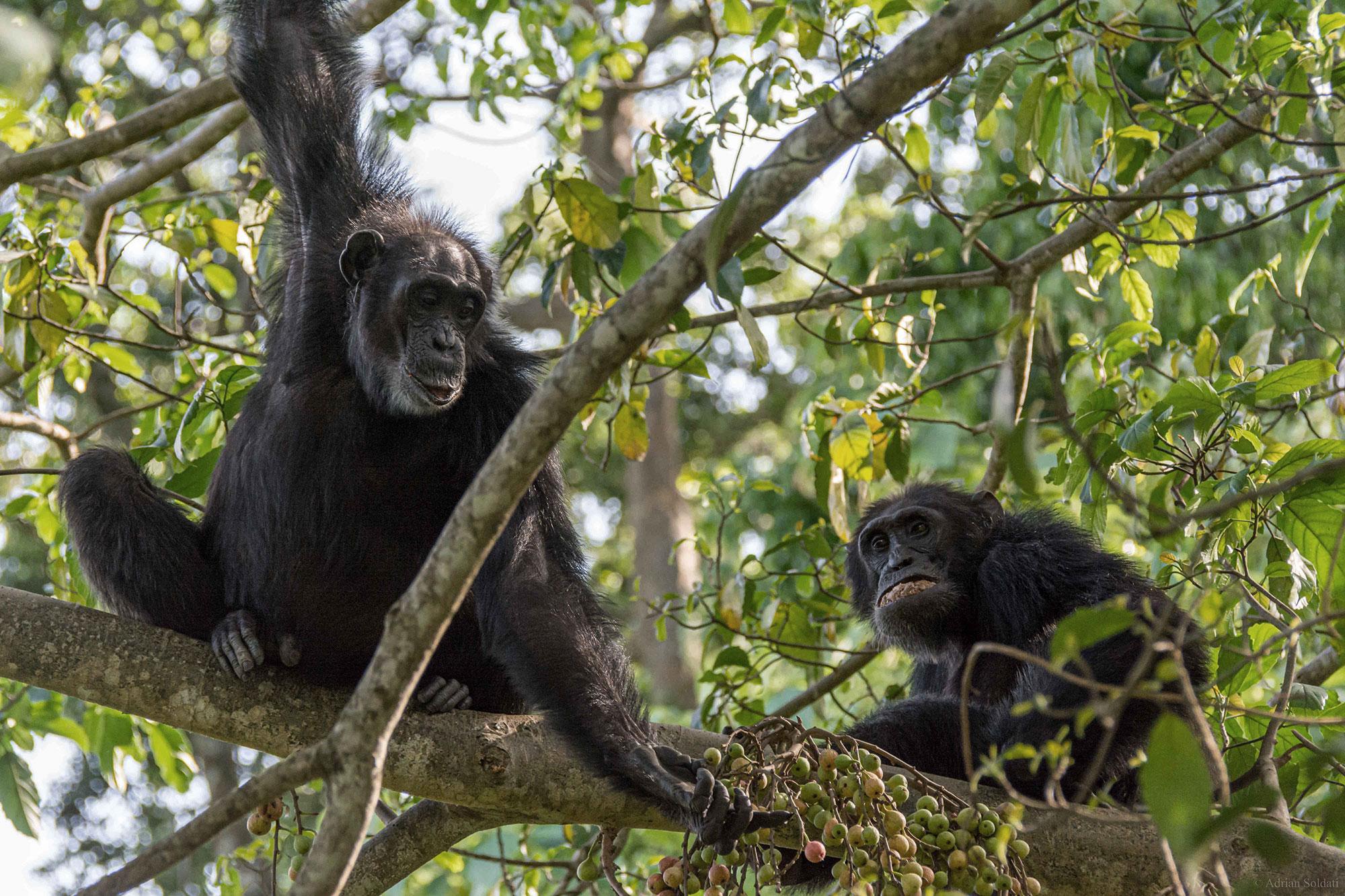 - Image for editorial purposes (JPEG). Caption: A group of chimpanzees eats together in the Ugandan jungle. © Adrian Soldati