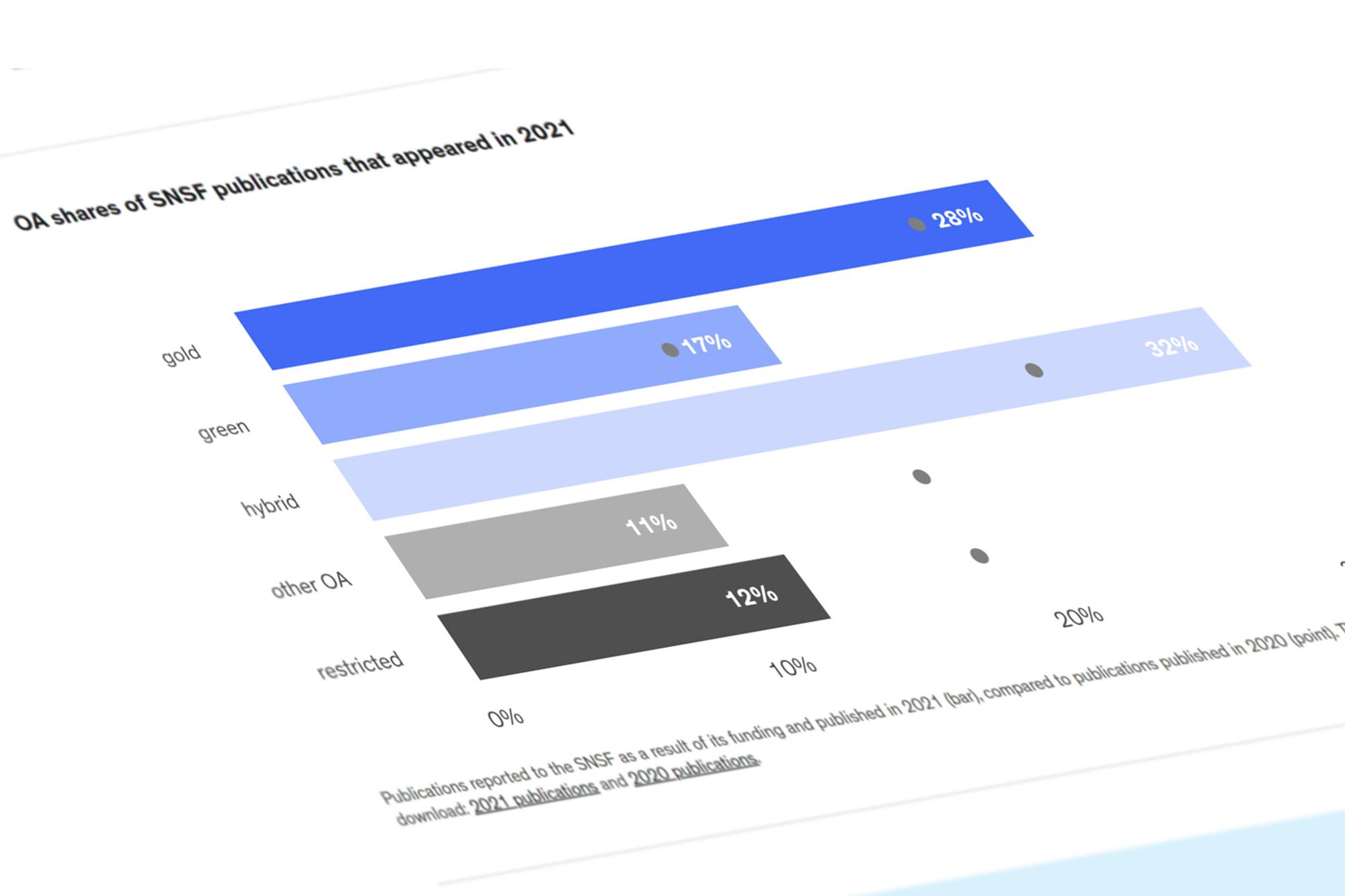 As part of our monitoring, we evaluated 14,641 publications resulting from SNSF-funded research published in 2021. Of these, 77% are available in Open Access (OA). An unprecedented increase over the 63% measured for 2020.
