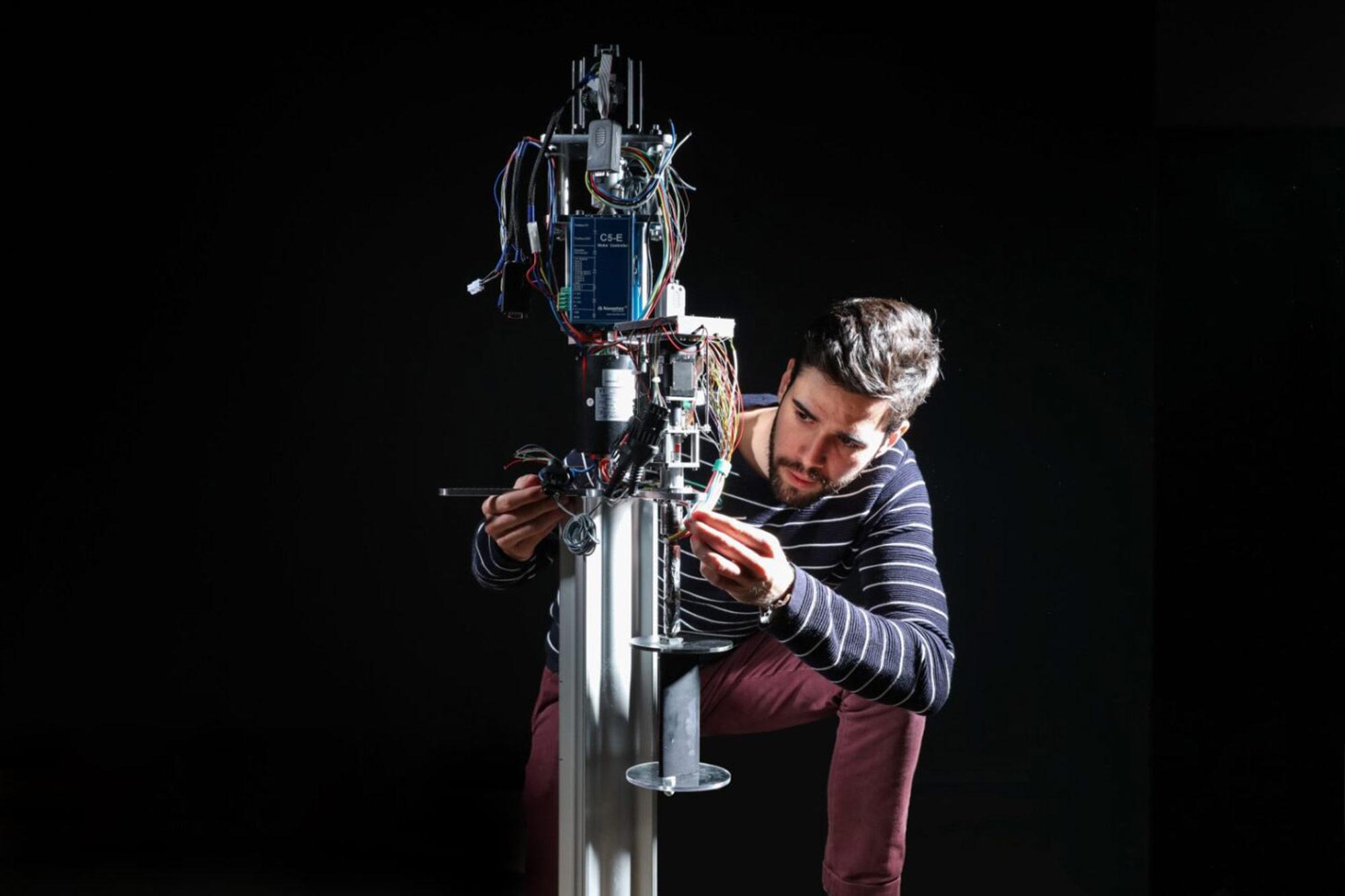 - Image for editorial use (JPEG). Caption: Sébastien Le Fouest with his motorised miniature vertical axis wind turbine equipped with sensors. © Alain Herzog/EPFL