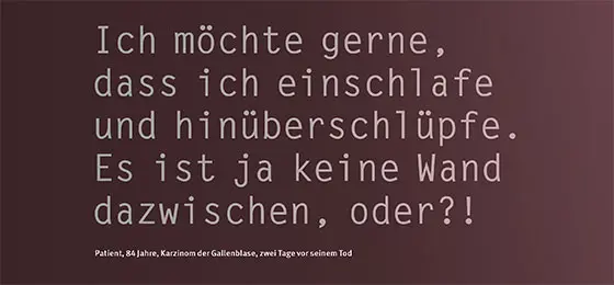So, after having been sent into exile, death is returning once again to our everyday lives. We used to be happy to delegate things to functionaries. But today, the notion of self-determination has even reached the dying process. Our epochal urge to individualisation is now getting to grips with dying. But the consequences are just as ambivalent as they are with any other such trend in our times. As always, self-determination also means self-commitment. And this applies just as much to those who are dying.