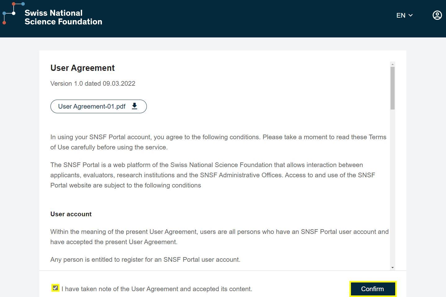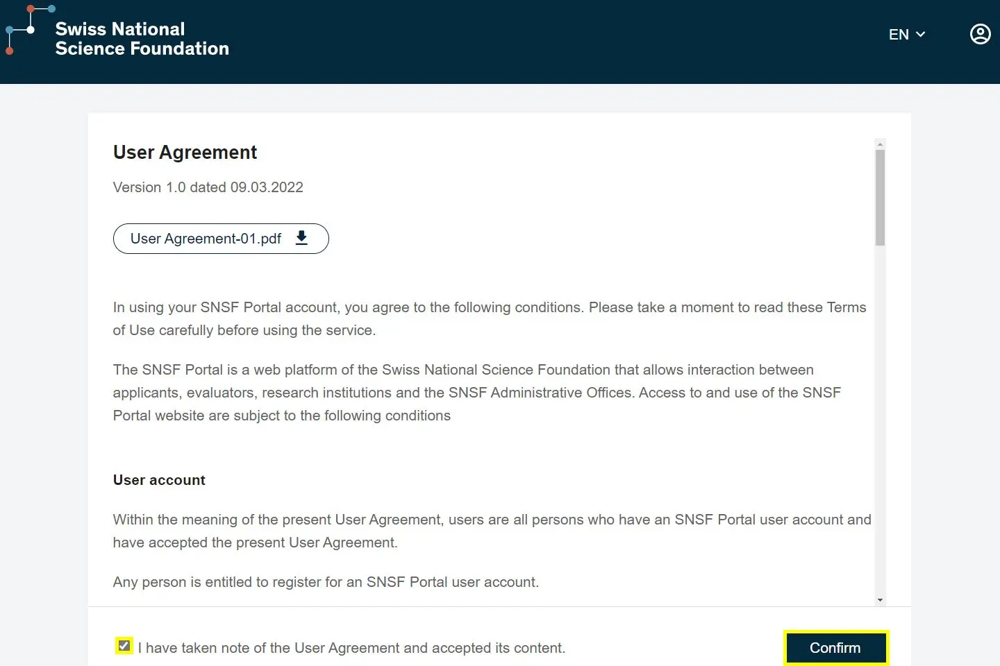 Please accept the User Agreement, then you can use the SNSF Portal.