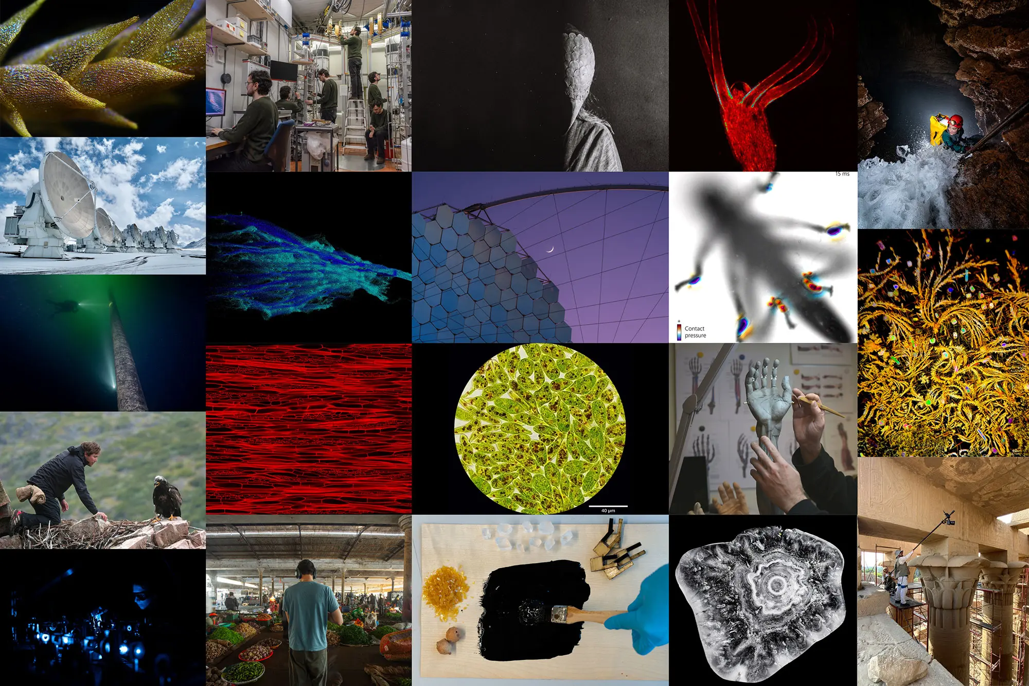 Seize mentions ont été attribuées à d’autres œuvres qui font découvrir l’iridescence délicate d’une mousse, des cristaux de vitamine B scintillants, du bois de balsa couleur rouge sang ou encore la rencontre entre un biologiste et un aigle sur une falaise au Groenland.
