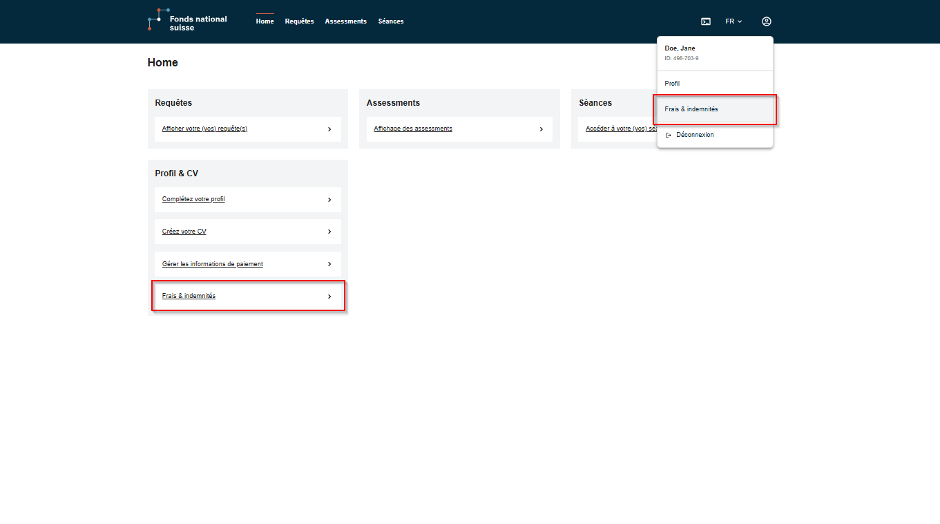 Capture d’écran 1 : Section des frais et indemnitésVous pouvez également sélectionner sur la page d’accueil, sous « Profil et CV », la rubrique « Frais et indemnités ».