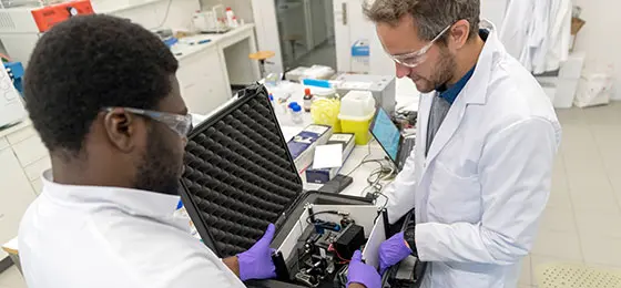 - Image 2: (JPEG) Un nouveau dispositif de diagnostic rapide de la malaria développé en Suisse grâce au soutien du programme Bridge. Jonas Pollard (droite) et Edward Apebende de l’Institut Adolphe Merkle replacent le prototype dans une valise capitonnée pour l’envoyer dans un pays touché par la maladie tropicale.