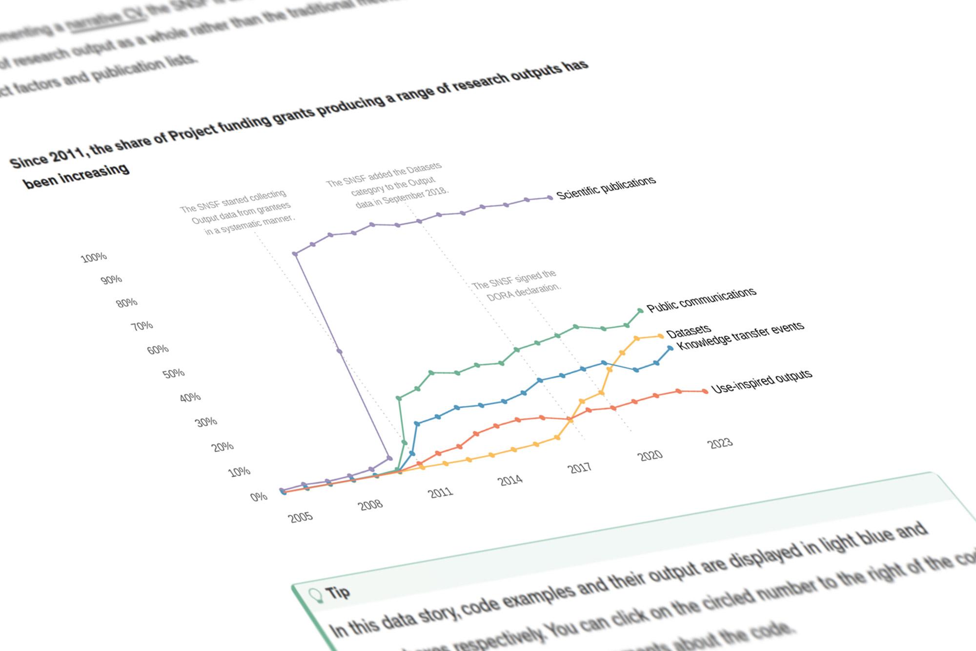 Le FNS facilite l'analyse de ses activités en fournissant des données en libre accès. Ce récit de données explique comment utiliser ces données afin d’analyser la diversité des productions scientifiques au sein des subsides FNS.