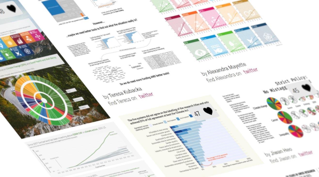 En novembre 2021, un hackathon sur la recherche suisse liée aux objectifs de développement durable (ODD) des Nations unies a été organisé par CorrelAid Switzerland et le Center for Cognitive and Decision Sciences de l’Université de Bâle. Les participant·es ont analysé les données publiques liées aux recherches que finance le FNS, en se basant notamment sur les titres, les mots-clés, les résumés scientifiques et les disciplines de chaque projet, ainsi que sur les données démographiques de base des bénéficiaires. Ils ont ensuite développé des visualisations de données pour mettre en lumière divers aspects de la recherche menée sur les ODD en Suisse.