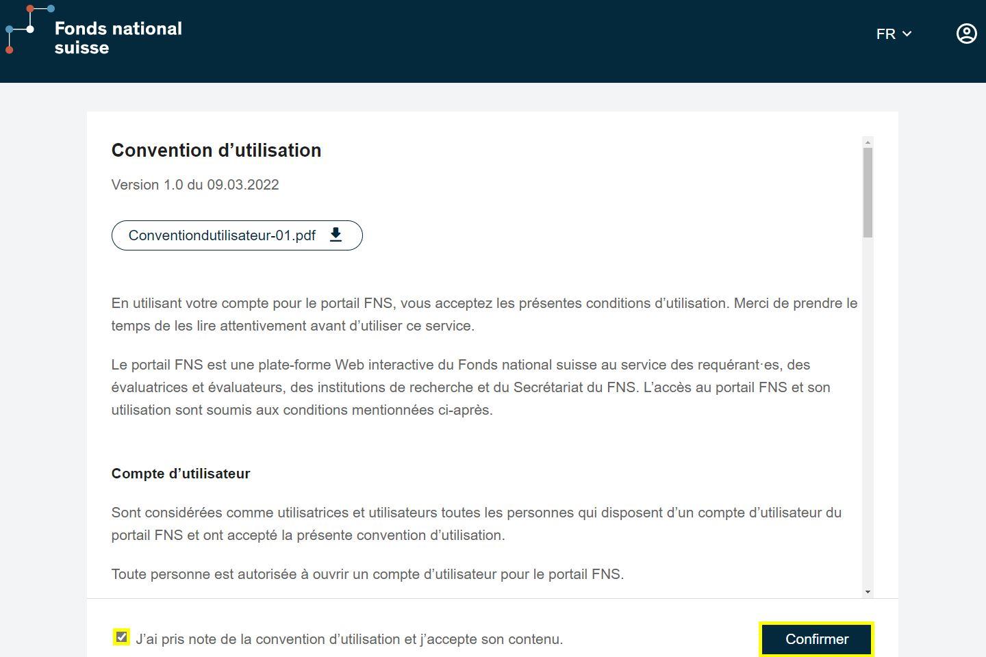 Veuillez accepter la convention d’utilisation, vous pourrez ensuite utiliser le Portail FNS.