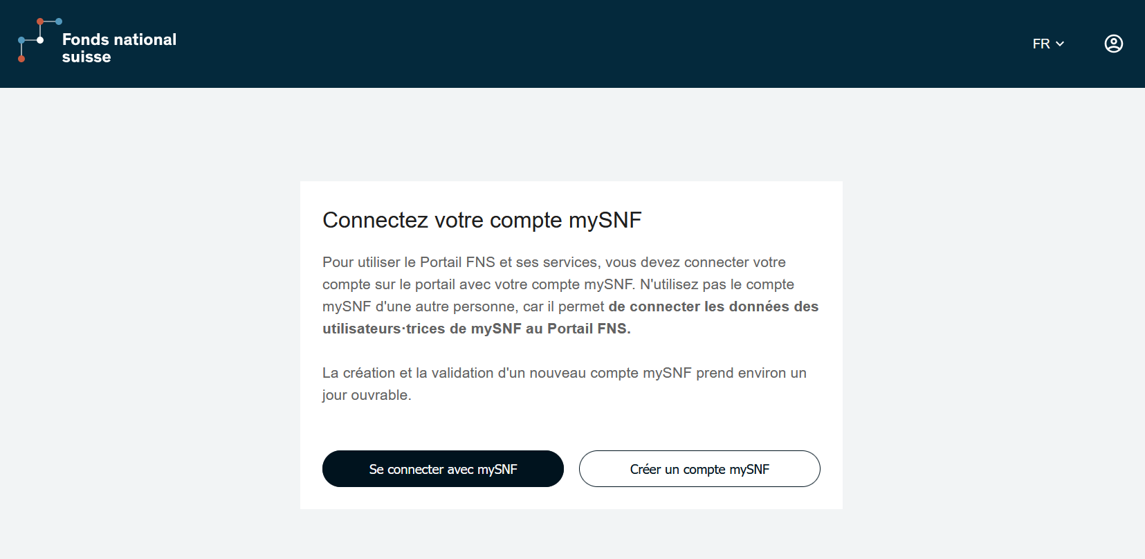 Pour utiliser le Portail FNS, vous aurez besoin d’un identifiant SWITCH edu-ID et d’un accès à mySNF. Vous trouverez ci-dessous une description des différentes étapes à respecter si vous connectez pour la première fois.