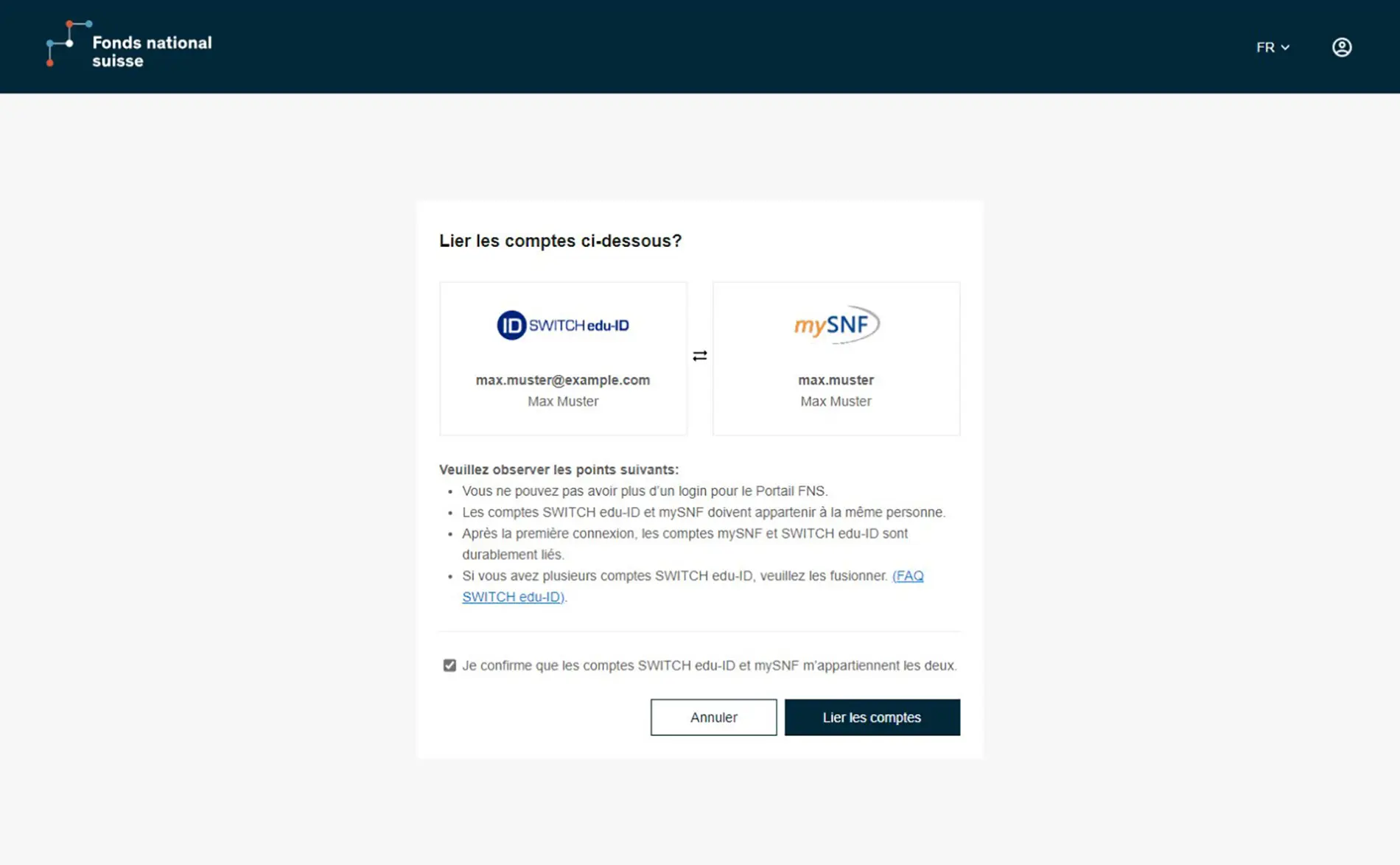 Confirmez que les comptes SWITCH edu-ID et mySNF vous appartiennent et liez les deux comptes. Veuillez lire attentivement, cette étape est irréversible.